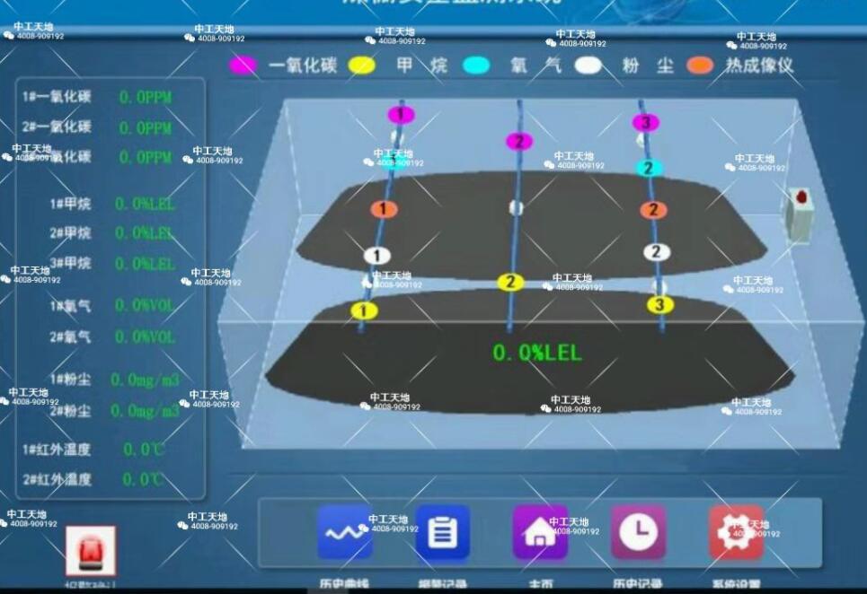 在自燃起火的初期,由于低溫氧化會(huì)產(chǎn)生一氧化碳,同時(shí)氧氣的濃度也發(fā)生變化,因此需要設(shè)置一氧化碳和氧氣的檢測裝置,進(jìn)行實(shí)時(shí)監(jiān)測,以便早期發(fā)現(xiàn),及時(shí)采取措施。由于煤發(fā)生氧化或通風(fēng)系統(tǒng)故障會(huì)引起氧氣濃度降低,為了確保工作環(huán)境的安全,應(yīng)保證氧氣的濃度在18%VOL以上;空氣中可燃?xì)怏w甲烷(CH4)的含量應(yīng)在1.5%以下,利用甲烷比空氣易擴(kuò)散的特性,在排氣流集中部位的煤場上部安裝甲烷濃度檢測儀,進(jìn)行實(shí)時(shí)監(jiān)測。